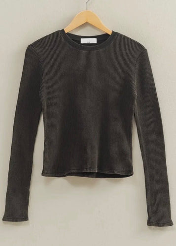 Mineral Wash Waffle Knit Long Sleeve Top | Black