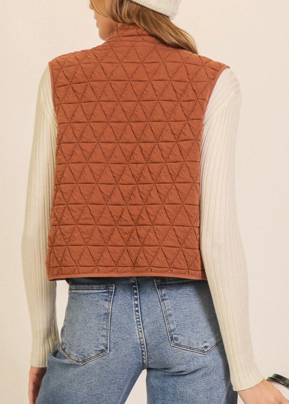Meet your new layering obsession. This quilted vest is equal parts cozy and cool-designed with a modern textured stitch and a streamlined fit that upgrades any outfit. It zips up for that effortless on-the-go vibe, while the high neck keeps things snug when temps dip. Whether you're throwing it over a striped tee or styling it with your fave oversized hoodie, this vest brings that polished-meets-chill energy we're all about. Bonus: side pockets to stash your essentials (or just warm your hands). It's the must-have layer you'll reach for again and again.