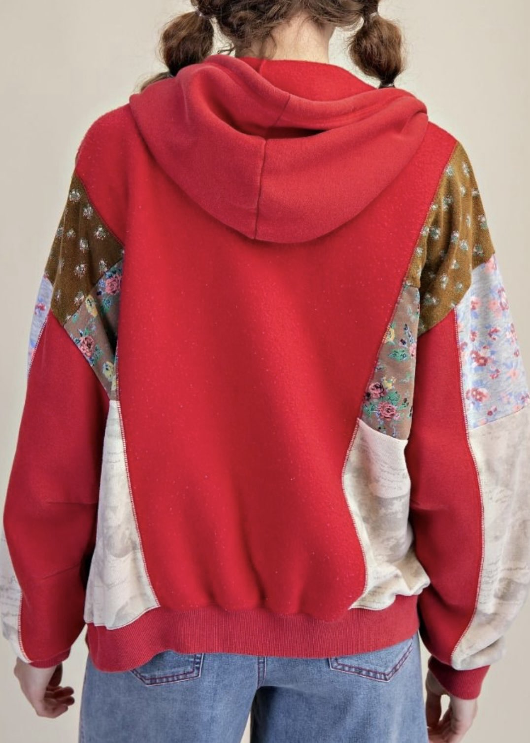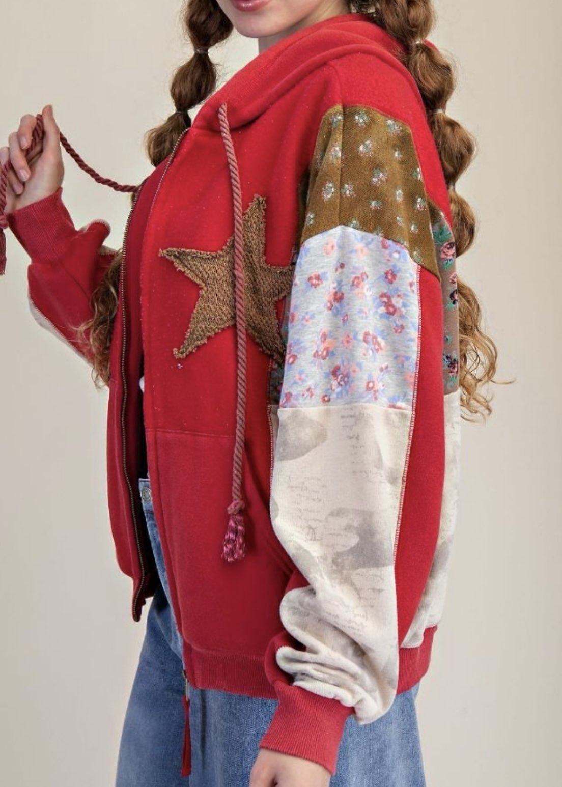 Stand out in comfort and color with our Star Patchwork Contrast Hoodie. Designed with a bold red base and unique mixed-print sleeves, this hoodie blends vintage charm with modern flair. The textured star appliqués and playful patchwork panels give it an artisan-inspired look that feels one-of-a-kind.