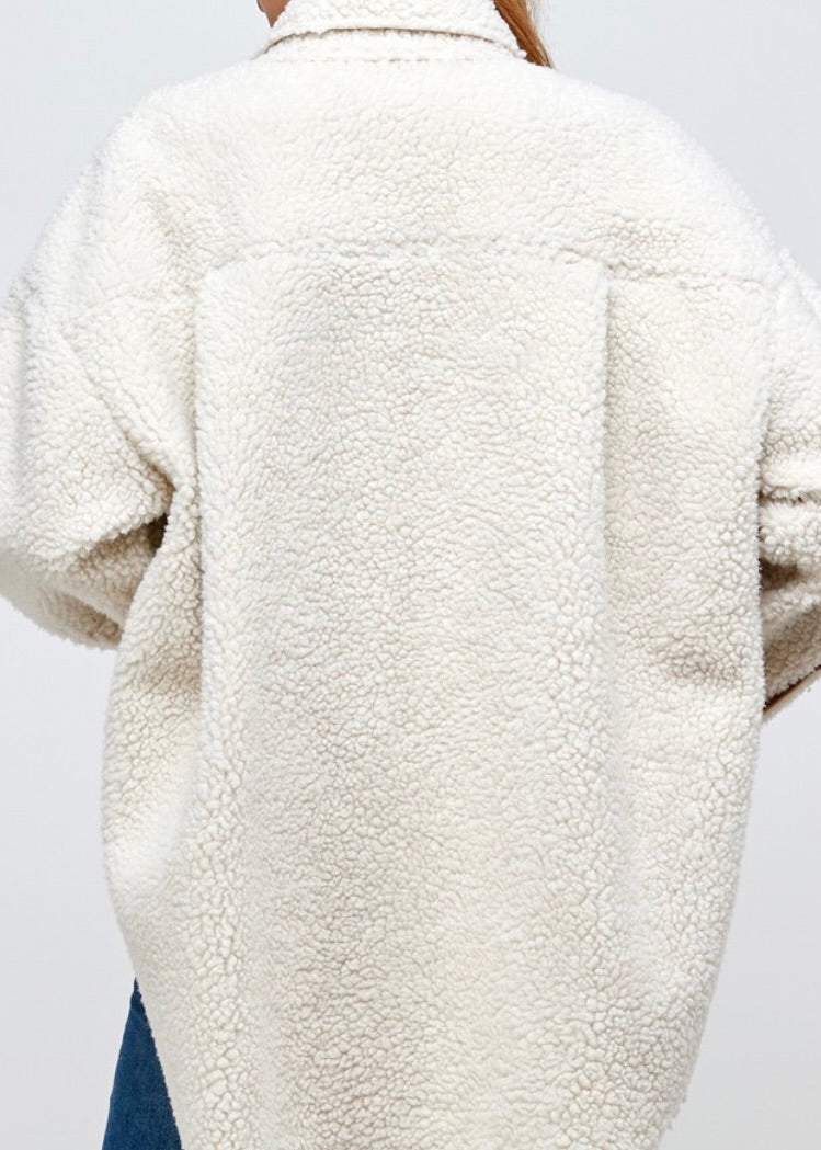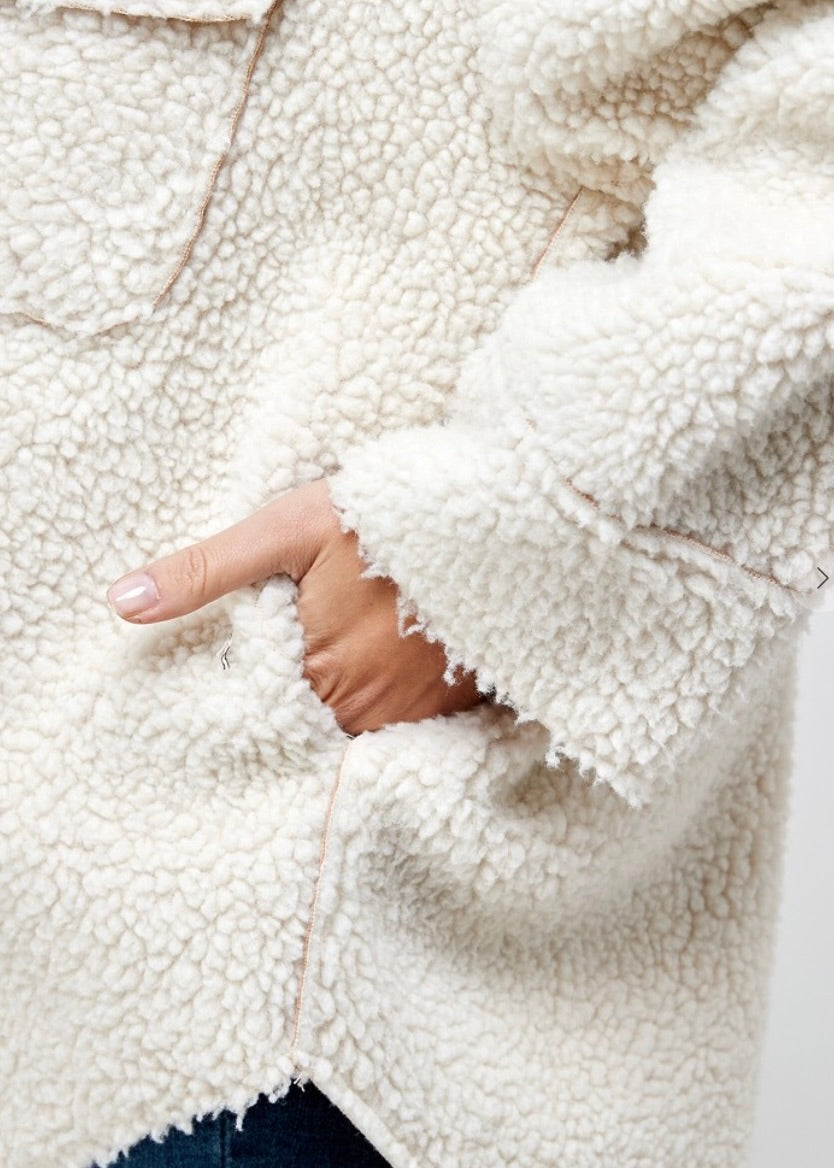 Warm enough to wear and soft enough to cuddle up with, cozy up in our oversized, cream, sheep fur jacket. This oversized jacket features a button down closure, two chest pockets, collar and side pockets.