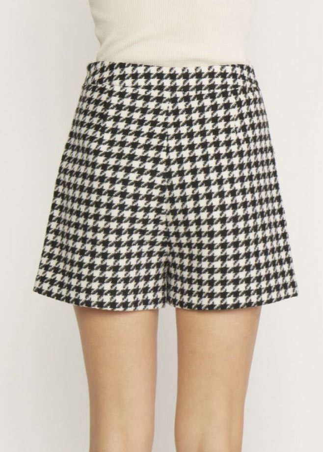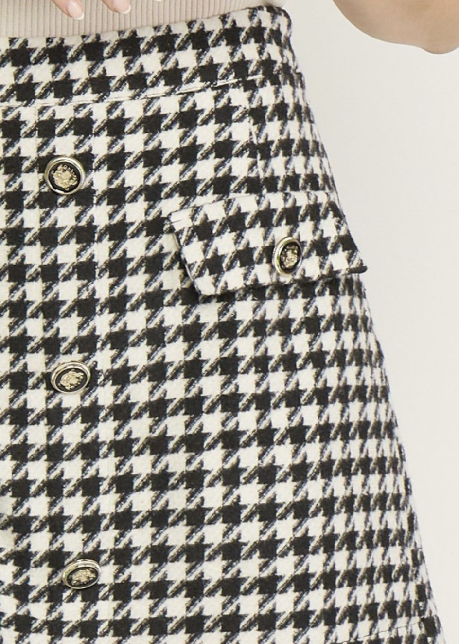 Our Elle Skort is a black and white houndstooth mini skort. Features faux, front patch pockets and gold and black button detail at the front.
