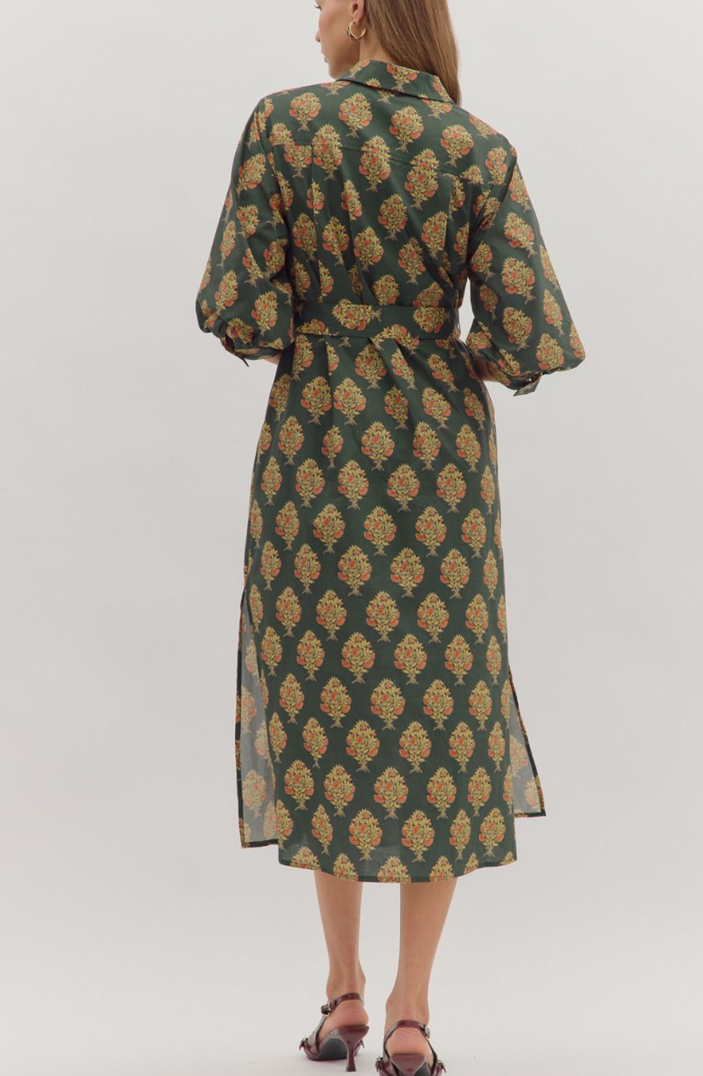 Fresh, feminine, and endlessly wearable—the Pine Blossom Dress is a modern take on the classic shirt dress. Designed with a button-front closure, collared neckline, and self-tie waist, it flatters every figure while keeping its effortless charm. The long sleeves with soft gathers add movement, while the pine green base and allover floral print bring a pop of color and pattern that feels both timeless and new.