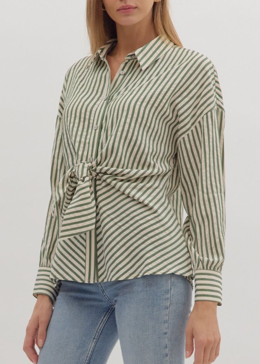 Classic shirting with a modern twist—the Olive Stripe Top brings fresh energy to a timeless silhouette. Designed with green and ivory stripes, this button-down features a self-tie detail at the front that cinches the waist for a flattering shape. Long sleeves with buttoned cuffs and a collared neckline keep it polished, while the lightweight woven fabric makes it easy for everyday wear.