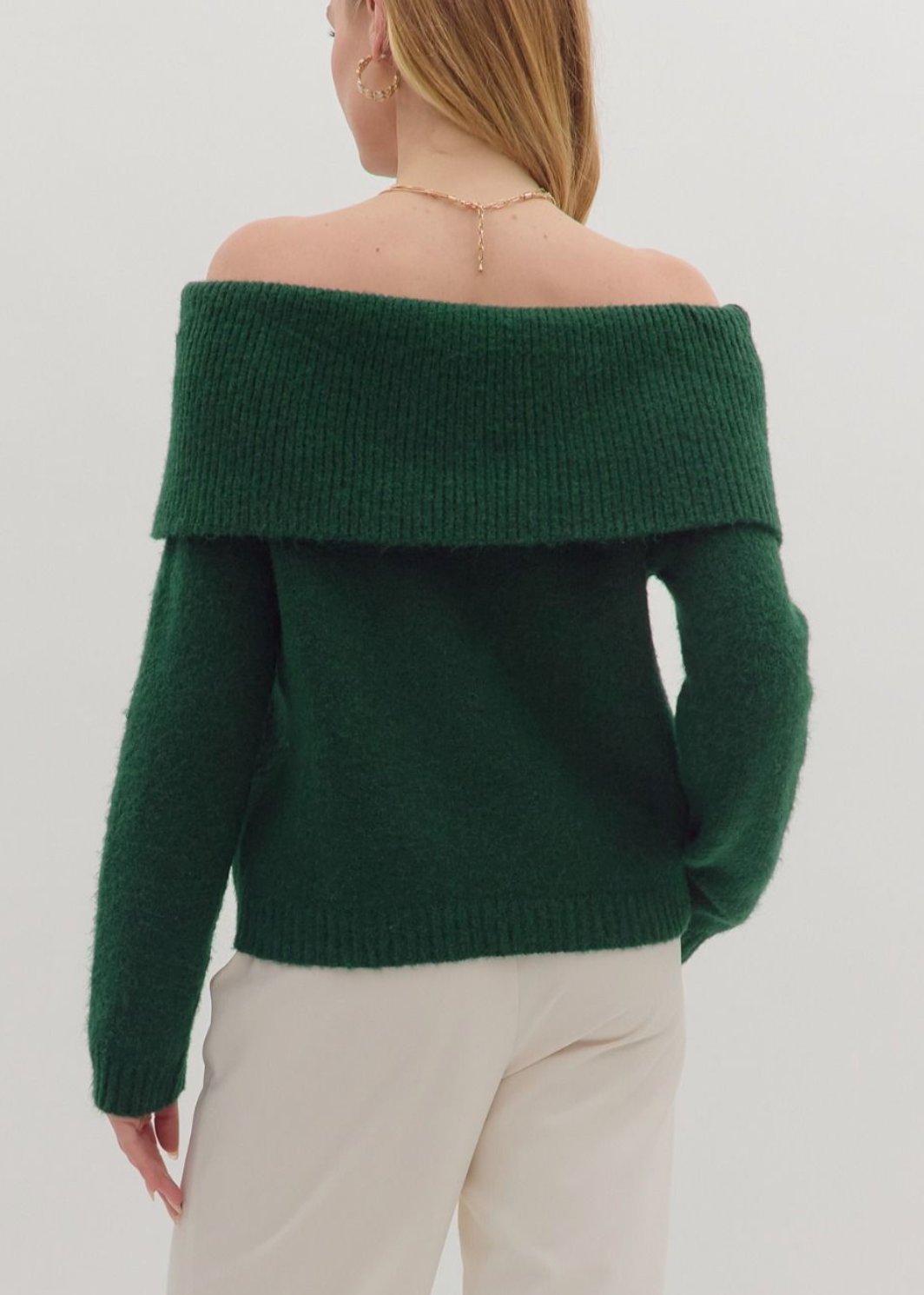 Chic, cozy, and made to turn heads—the Evergreen Sweater is your new go-to for statement style with everyday comfort. Featuring a foldover ribbed neckline that drapes off the shoulders, this knit offers a flattering silhouette that’s equal parts feminine and modern. The long sleeves and medium-weight knit keep it cozy, while the deep green hue adds a sophisticated pop of color.