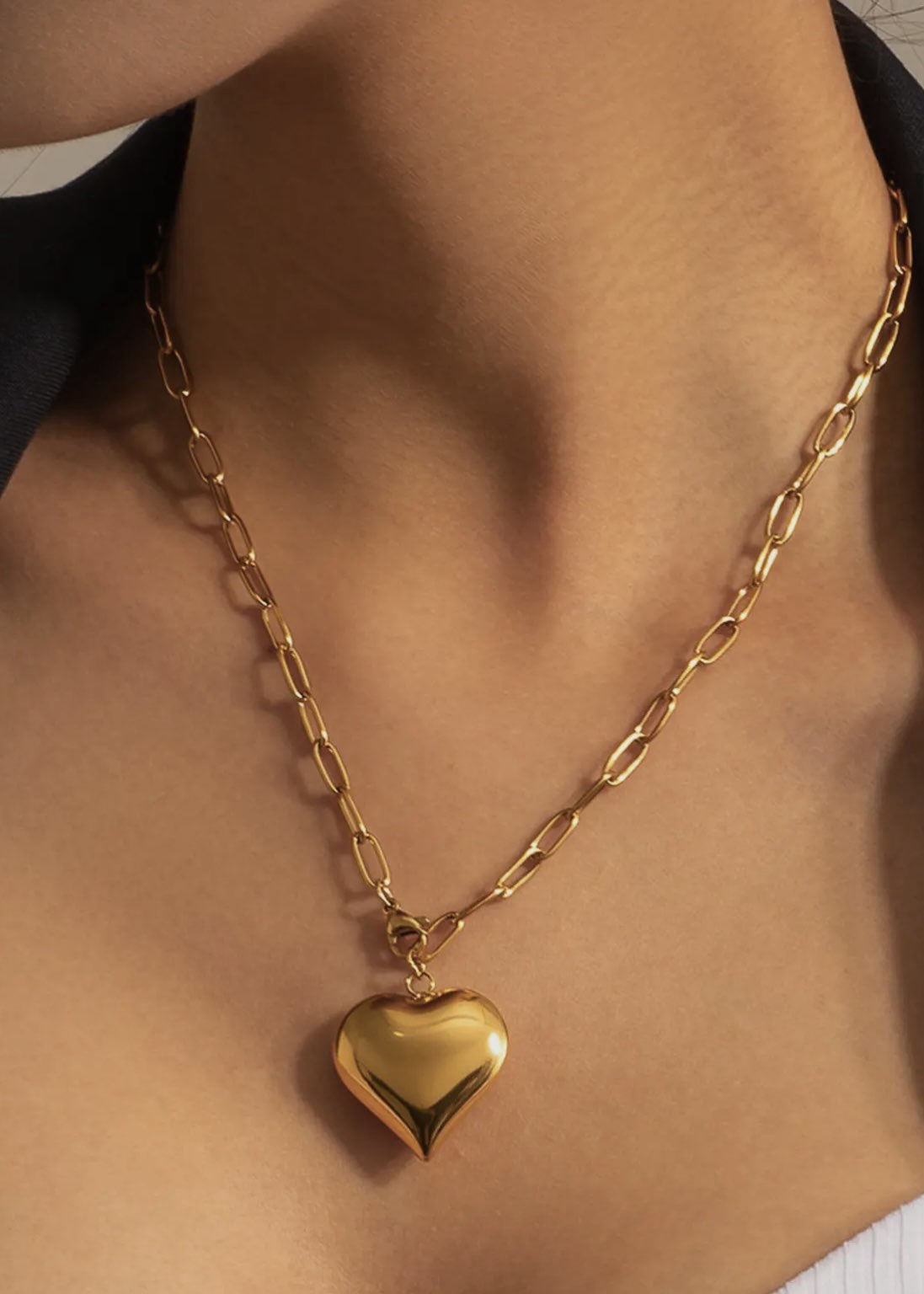 Bold yet beautifully feminine, the Paris 18K Gold Non-Tarnish Large Heart Chain Necklace makes a statement with timeless sophistication. Crafted from durable stainless steel and plated in radiant 18K gold, this necklace features a striking 1-inch heart pendant suspended from a chic, modern chain. Its polished finish and sculptural silhouette create a perfect balance of elegance and edge—an instant classic for any jewelry collection.