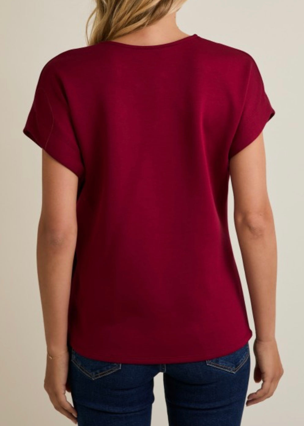 Sleek and modern, this short sleeve top is crafted from smooth scuba fabric that gives it a structured yet comfortable feel. Designed in a rich wine color, it features a classic round neckline and a front tie detail that adds a flattering, feminine finish. Perfect for pairing with high-waisted trousers, skirts, or denim, this versatile piece effortlessly transitions from work to weekend.