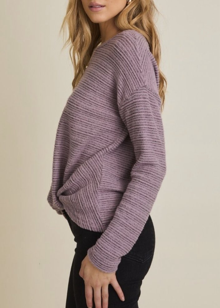 Casual and flattering, the Extended Lavender Long Sleeve Bottom Twist Stripe Rib Top adds an easy touch of charm to your everyday wardrobe. Designed with a soft ribbed texture and subtle stripe pattern, it features a front twist hem that creates a naturally draped silhouette.
