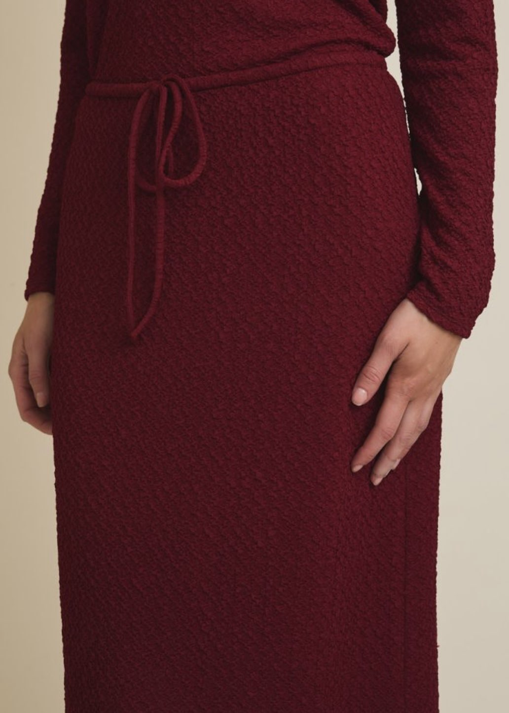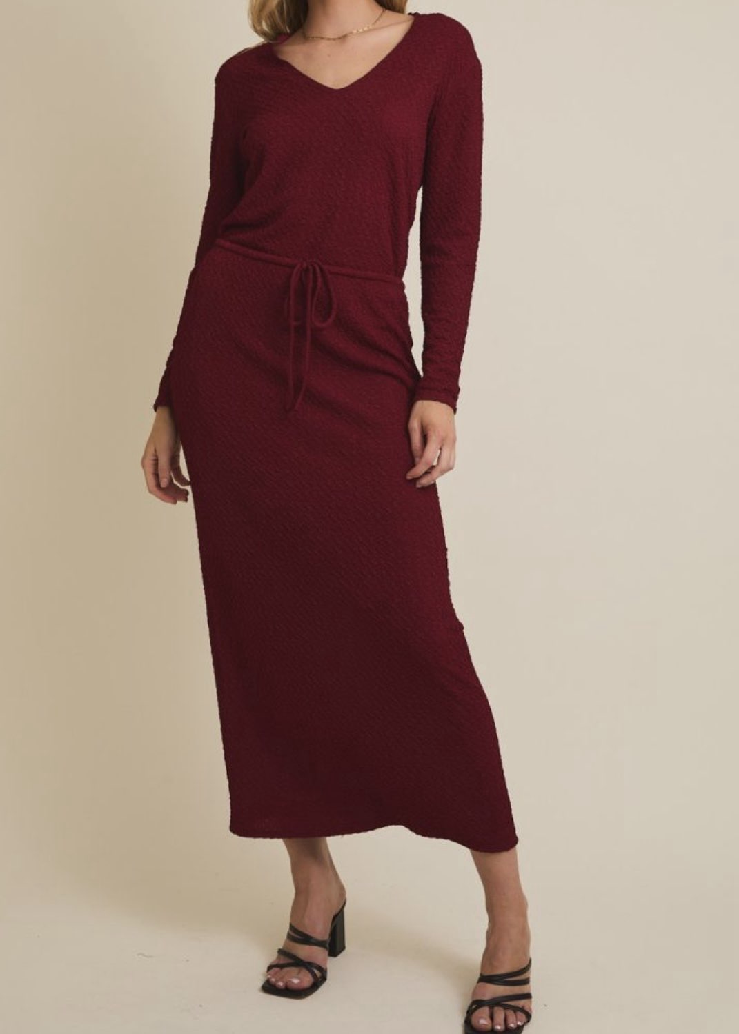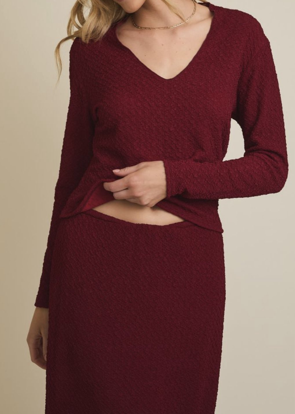 Effortlessly chic and comfortable, the Burgundy Knit Two-Piece Set features a textured V-neck long sleeve top paired with a drawstring pencil skirt for a coordinated, polished look. The soft knit fabric offers a flattering fit with just the right amount of stretch, making it perfect for work, dinner plans, or weekend outings.