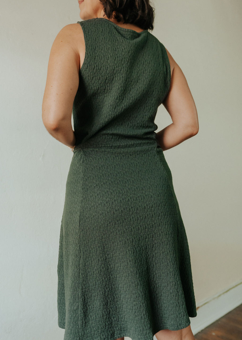 Our Marcy Dress is a gorgeous textured, dark olive, fit and flare mini dress. This sleeveless dress features a round neckline and gold buckle detail on the waist. Hassle free with no zippers or buttons and bra friendly, too! Style with gold earrings, gold bracelet, and a nude heel for polished, put together look.