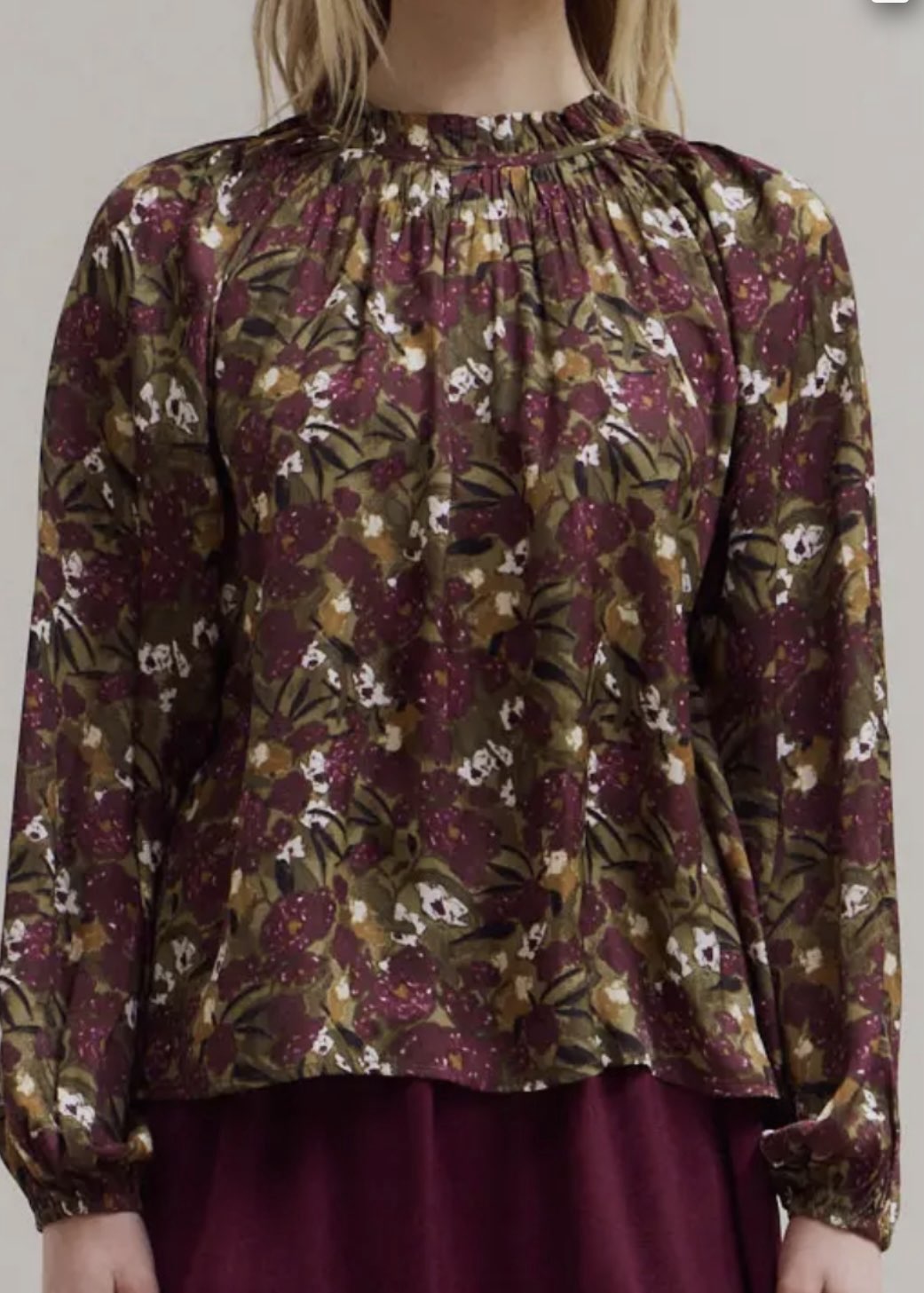 Romantic and refined, the Woodland Blooms Ruffle Blouse features a delicate floral print in olive, burgundy, camel, black, and white. Designed with soft balloon sleeves and a ruffle-trim neckline, this lightweight top drapes beautifully for an effortlessly feminine silhouette.
