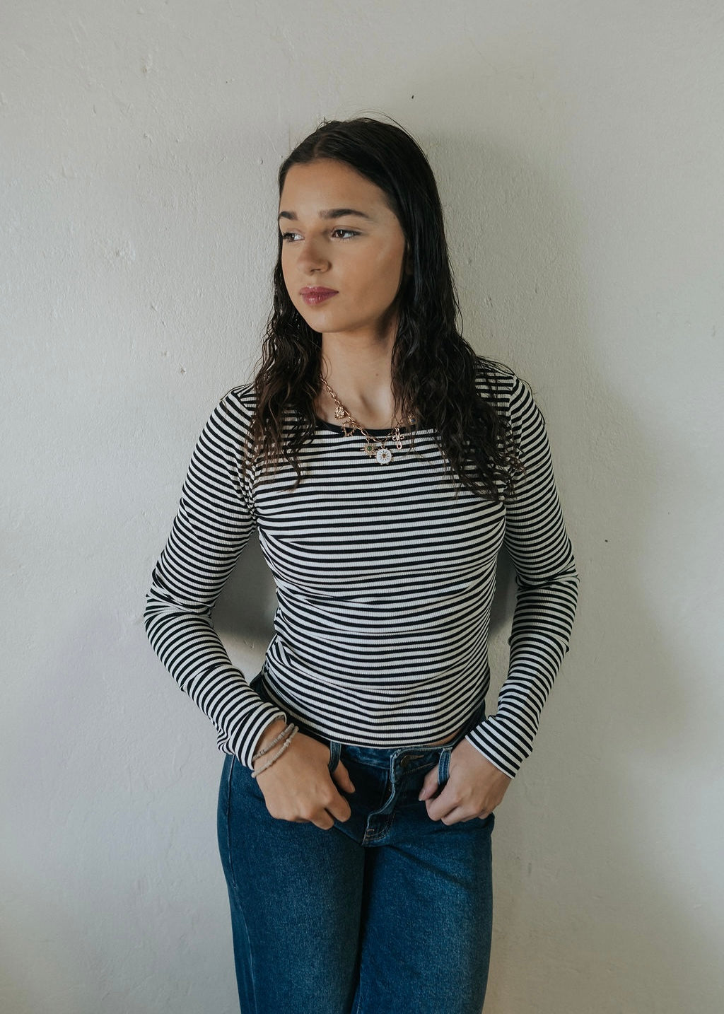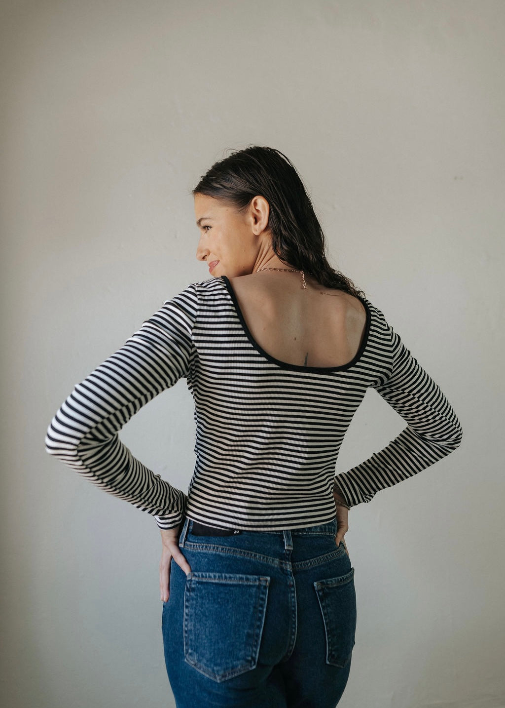 Embrace striped in this modern take on a long sleeve top. Classic stripe pattern exudes a casual, but chic vibe. This long sleeve tee features a scoop back and a silhouette that hugs making it a versatile piece. Cute alone and ideal for layering this top is great with vests and blazers.