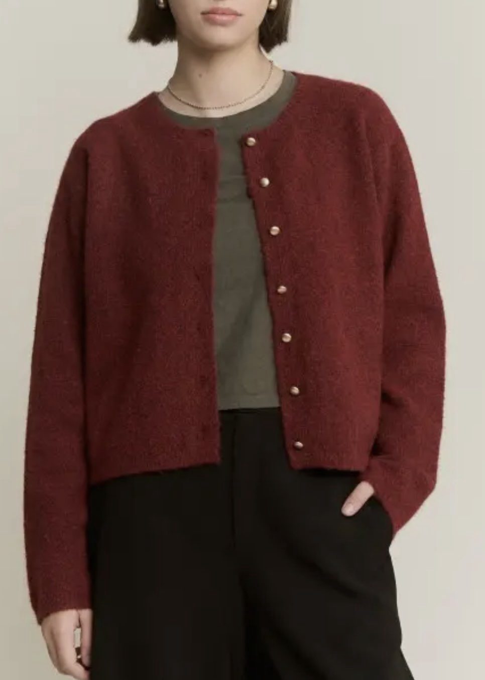 Features: Button-down style, relaxed fit, drop shoulders, gold button detailing, soft textured knit