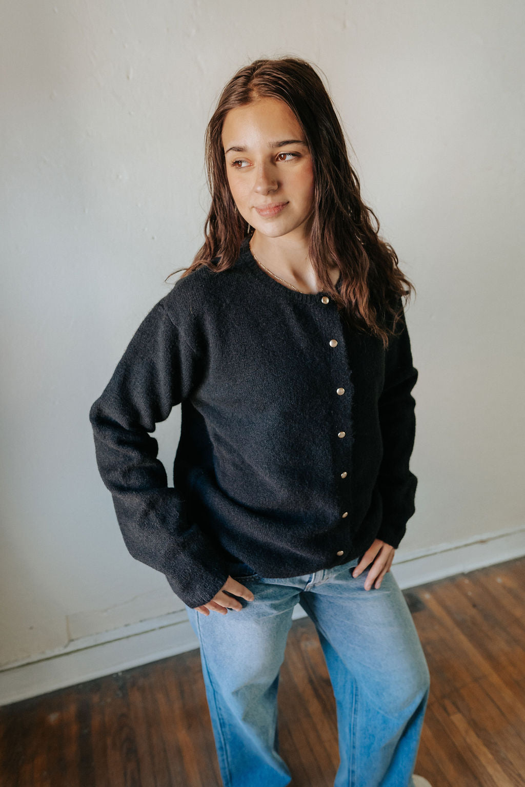 Features: Button-down style, relaxed fit, drop shoulders, gold button detailing, soft textured knit