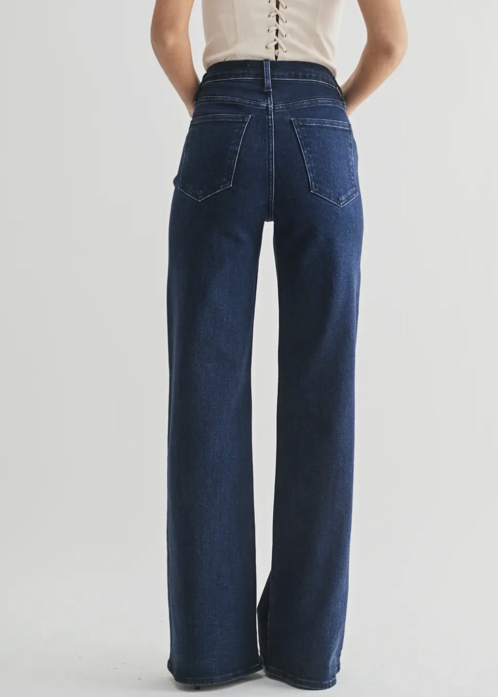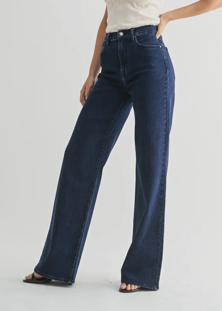 Crafted in the United States from a premium blend of cotton, polyester, and spandex, this denim offers the ideal balance of softness, stretch, and durability. A true statement jean, the palazzo cut transitions seamlessly from everyday wear to elevated occasions.