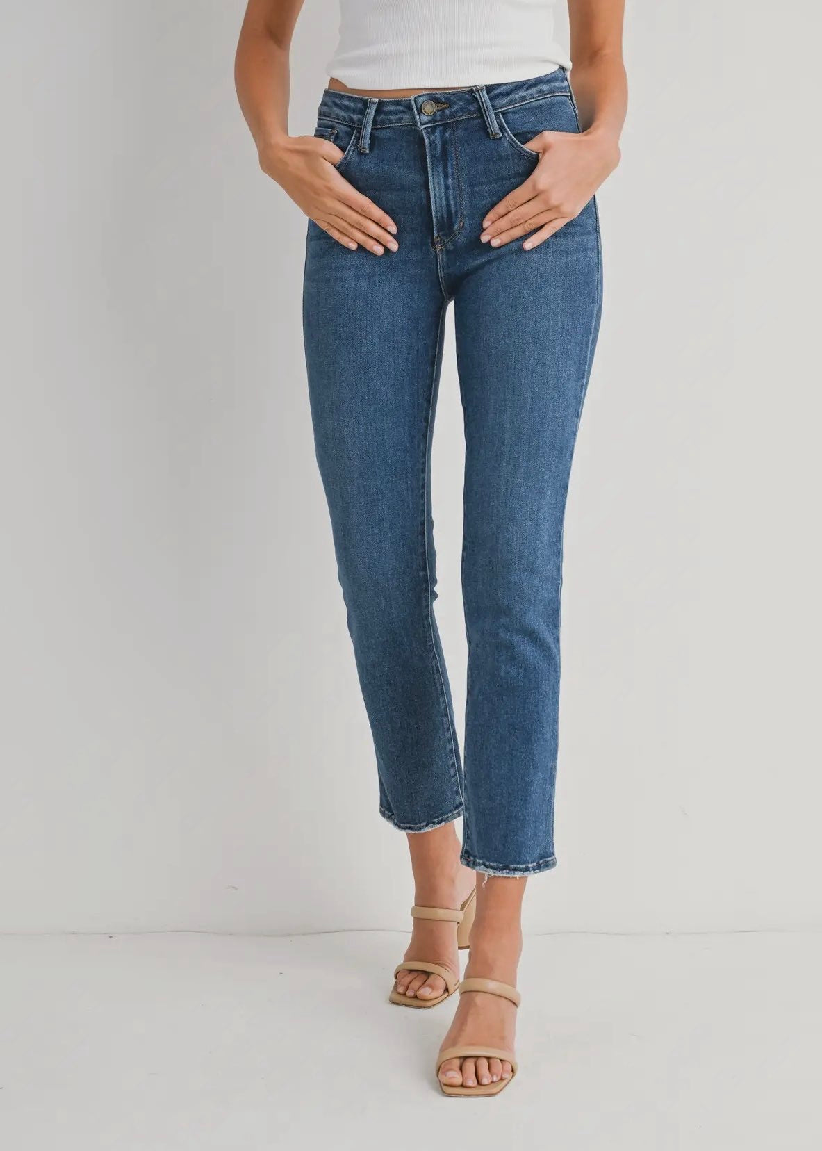 Our Just Black Denim Distressed Hem Straight Leg Jeans are a comfortable dark wash, straight leg jean that’s just a touch slimmer through the legs. A mid-rise waist and subtle distressing around the hems make this the perfect pair for leisurely strolls or long lunches. Features a zipper button closure, 5 functionals pockets and belt loops.