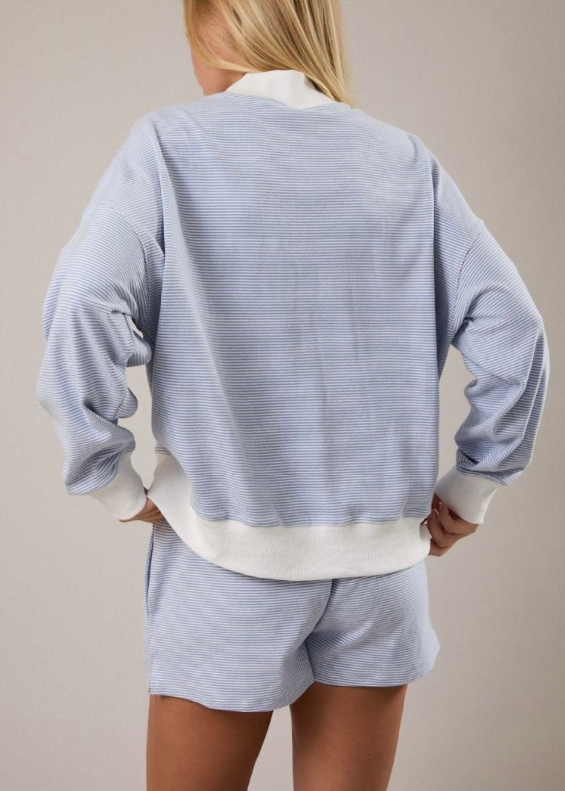 Cozy and coastal inspired, the Mock Neck Stripe Sweatshirt Top features soft blue and creme stripes in a comfortable everyday silhouette. The mock neckline adds a modern touch, while the relaxed fit makes it easy to style for casual days or weekend lounging.