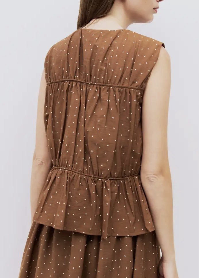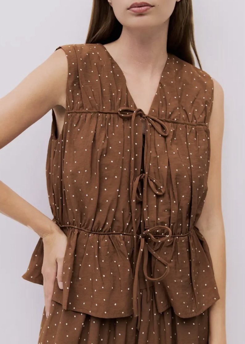 Designed to perfectly complement the Melinda Skirt, the Melinda Polka Dot Tie Front Top brings an easy, playful charm to your wardrobe. Crafted in a rich brown fabric with crisp white polka dots, this sleeveless top features a relaxed, loose silhouette that feels light and effortless.