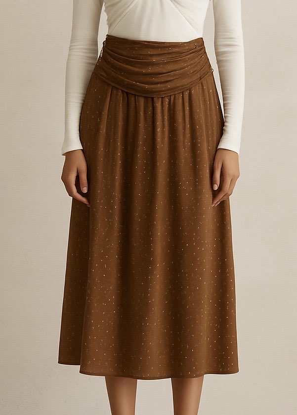 Classic with a modern twist, the Melinda Polka Dot Midi Skirt brings effortless elegance to your everyday wardrobe. Designed in a rich coffee-brown hue with delicate polka dots, this flowy midi skirt features soft draping at the waist for a flattering, feminine silhouette. The lightweight fabric moves beautifully with every step, while the midi length offers timeless versatility — perfect for dressing up or down.
