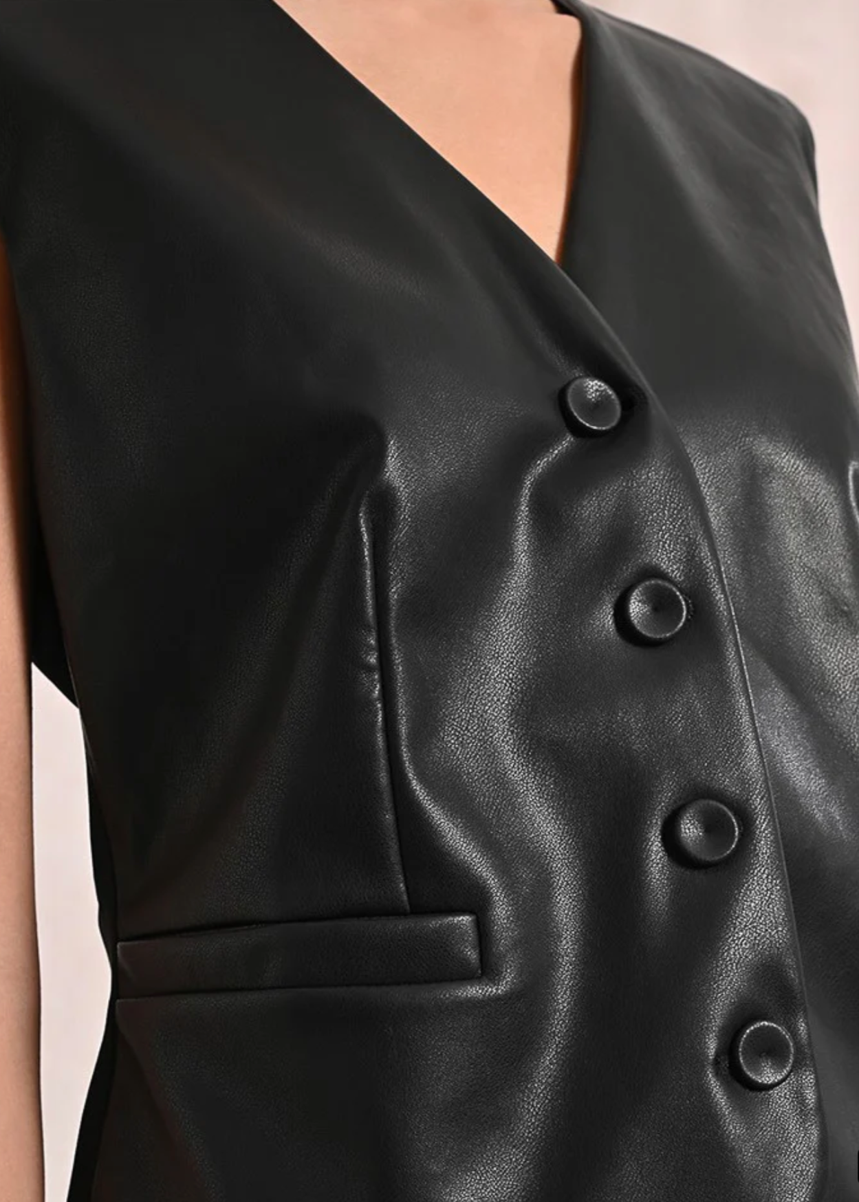 Tailored and trend-forward, The Simone Faux Leather Vest is the perfect partner to its matching skirt—or a standout on its own. Designed in a cropped blazer silhouette, it features a sleek V-neckline, wide front darts for shaping, and welt pockets for a polished finish. The covered button closure keeps the look refined, while the sleeveless cut adds a modern edge.