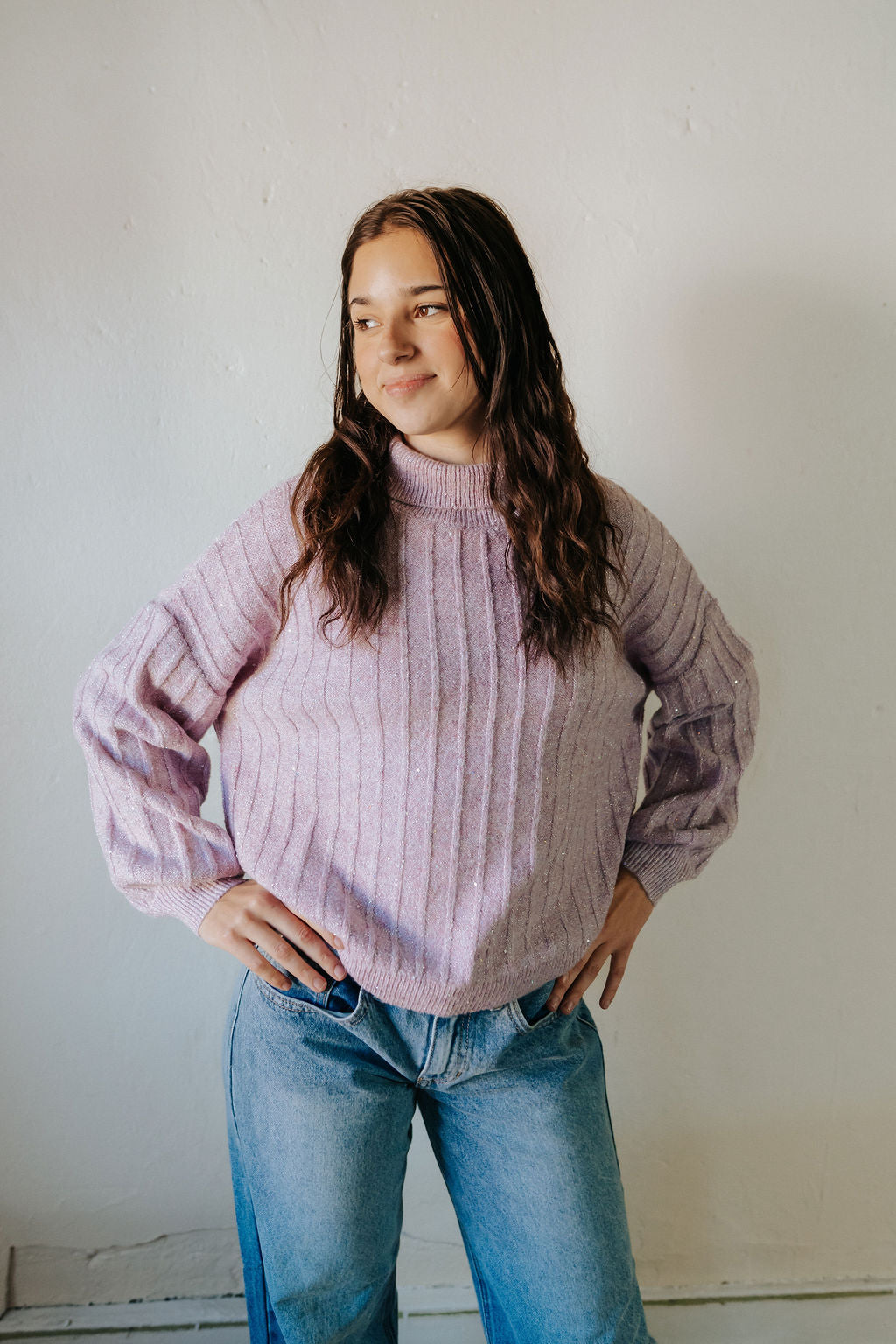 Add a touch of sparkle to your everyday style with this knitted sweater featuring subtle glitter inserts. Designed with long puffed sleeves and tightened cuffs, it offers both comfort and elegance. The stand-up collar gives it a modern edge, while the short cut makes it perfect for pairing with high-waisted jeans, skirts, or trousers. Cozy yet chic, this sweater is the ultimate blend of laid-back ease and refined detail. Wear it tucked into wide-leg denim for casual charm, or pair with a sleek midi skirt for an elevated evening look.