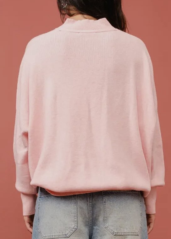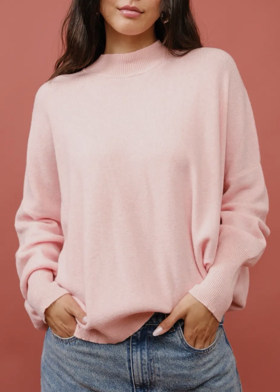 Wrap yourself in cozy sophistication with the Soft Blush Cashmere Blend Crewneck Sweater. Crafted from a luxuriously soft 7-gauge knit, this oversized silhouette features a refined mock neckline, dropped shoulders, and a longer length that drapes beautifully for an effortlessly relaxed fit. The delicate pink hue adds a touch of femininity, while the cashmere blend gives it that ultra-soft, elevated feel Modish is known for.