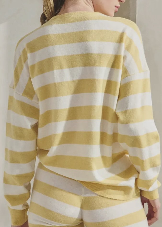 Soft, cozy, and effortlessly chic — the Striped Cashmere Blend Sweater is the definition of laid-back luxury. Designed with a classic round neckline and a slightly relaxed fit, it drapes beautifully for that easy, loungewear-inspired look that still feels refined. The timeless stripe pattern adds a touch of casual sophistication, perfect for pairing with denim or layering over crisp basics.