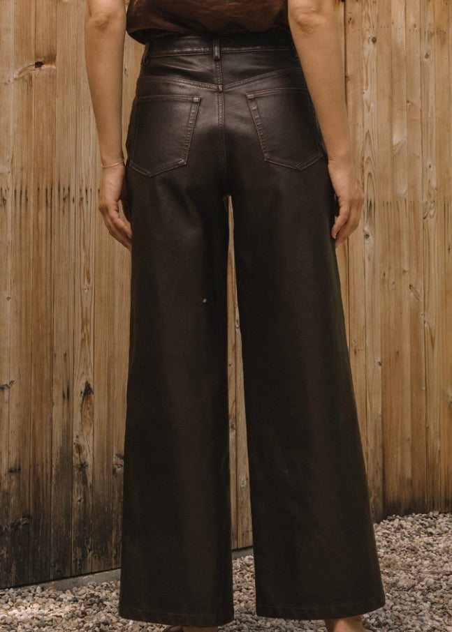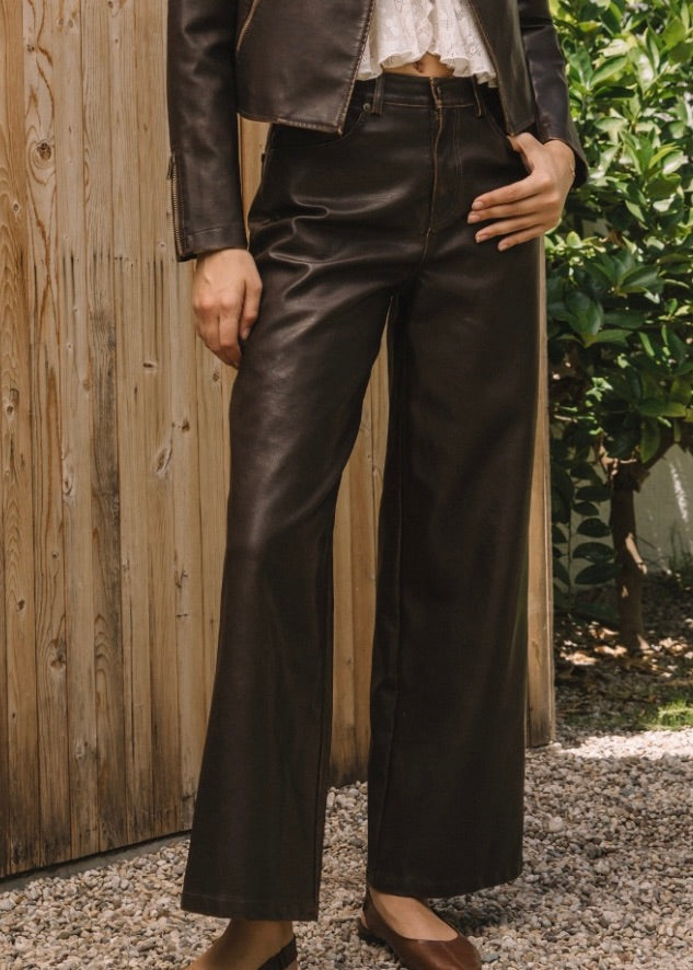 Our Tate Pants are distressed, coco brown, faux leather wide leg pant. Features a high rise, button zipper closure, functional pockets and belt loops. Style with our Tate Moto Jacket the complete looks.