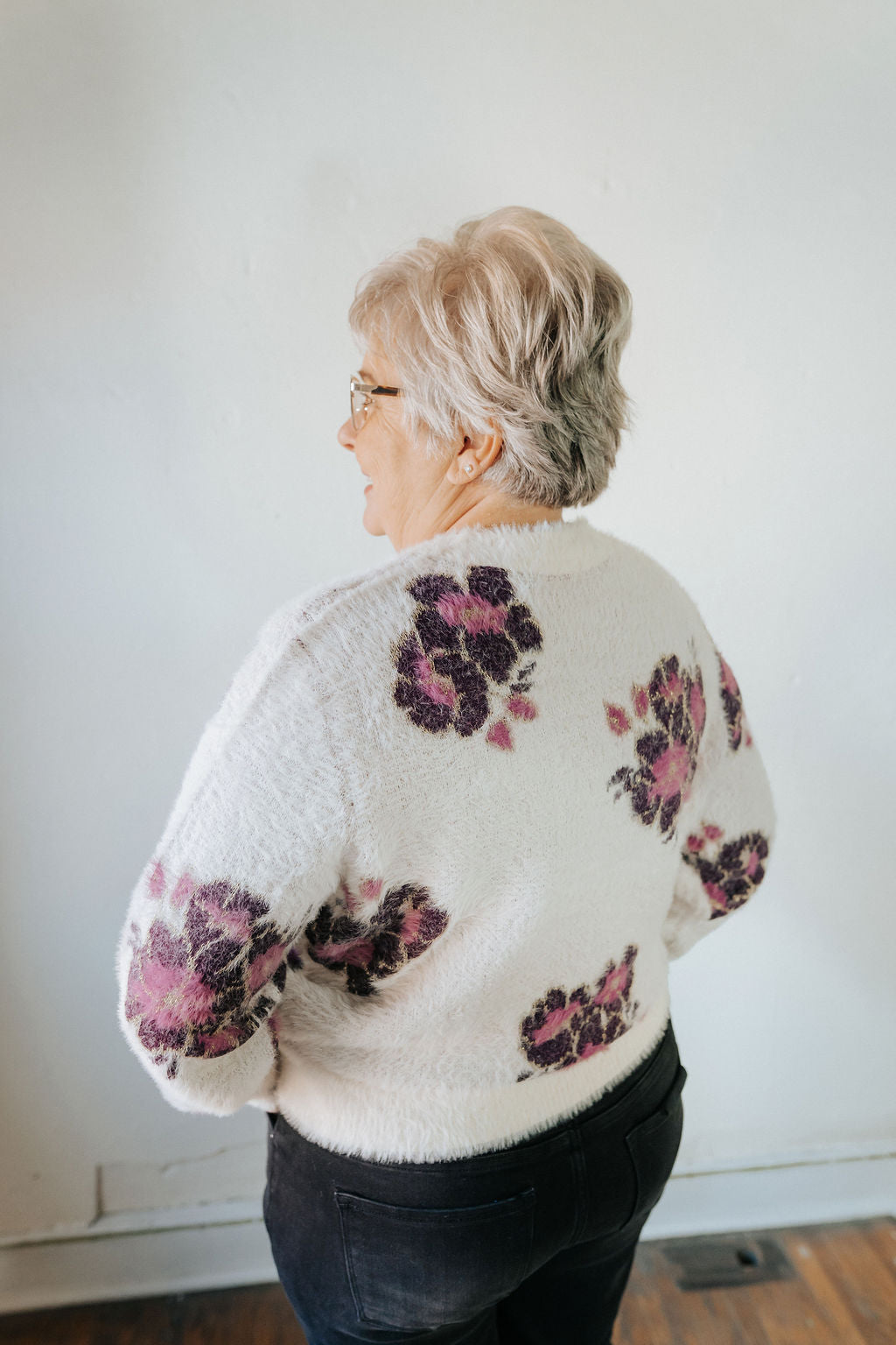 Bring a little sparkle to cozy season with The Rosalie Fuzzy Sweater. Designed in a cream base with textured floral patterns in deep plum and berry tones, it’s a festive twist on everyday comfort. The soft, fuzzy knit feels plush and warm, while subtle metallic fibers catch the light—adding just the right touch of holiday shimmer.